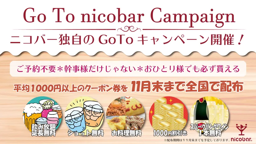 株式会社ニコバー(本社:東京都新宿区、代表取締役社長:中村 建)は、2020年10月22日より、全国のニコバー(北海道・仙台・東京・埼玉・石川・名古屋・大阪・広島・香川・福岡・沖縄に計14店舗)にて、独自のGoToキャンペーンを開催する運びとなりました。
