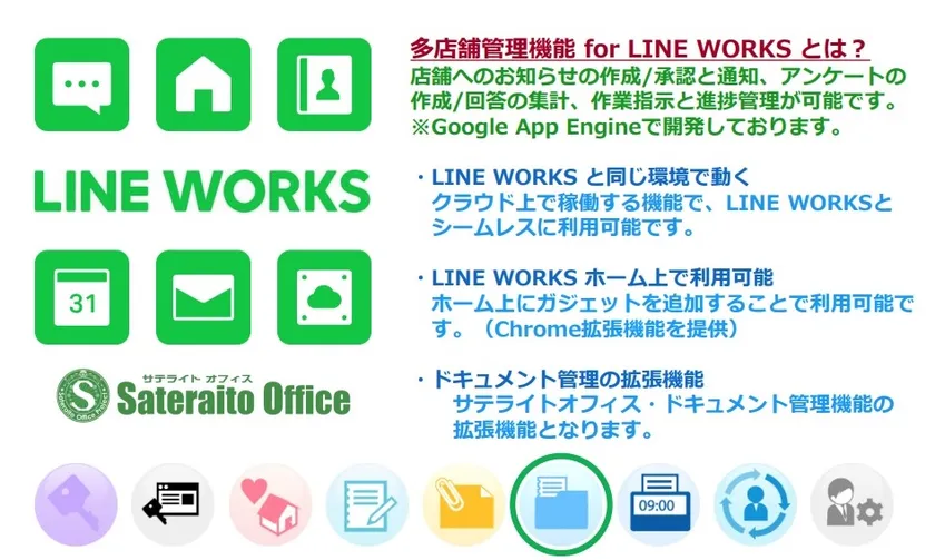 株式会社サテライトオフィス(本社:東京都江東区、代表取締役社長:原口 豊、 https://www.sateraito.jp/ )は、ビジネス版LINE「LINE WORKS」導入企業向けに、LINE WORKSとシームレスに動く、本社/本部から各店舗への情報伝達/指示ツール「多店舗管理機能」を提供開始したことを発表いたします。