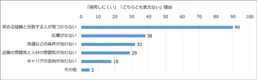 採用に要する期間は、6ヶ月以上かかる企業が48%と半数近く、12ヶ月以上かかる企業が22%です。採用の印象については、96%が「採用しにくい」か「どちらとも言えない」と回答しており、その理由として「求める経験と合致する人が見つからない」が最も多く、次いで「応募数が少ない」が多いことから、求める人材を探し採用するのが難しいことがわかります。