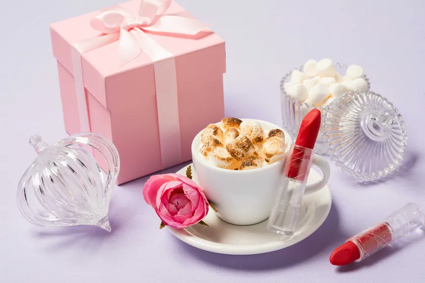 ヘーゼルナッツ香るホットホワイトチョコレートに、生クリームとマシュマロを乗せ、バーナーで香ばしく焼いたデザートドリンクです。シナモンやナツメグなどのスパイスが入ったリップスティック型のチョコレートを混ぜながらお楽しみください。
