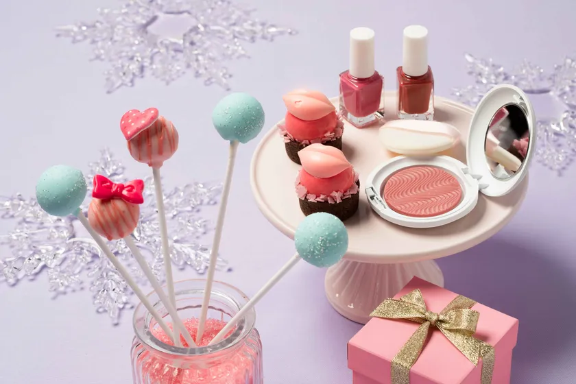 「シャンパンロリポップ / ルビーチョコと苺のロリポップ」(写真左) 「Kiss me 苺リップのタルト」(写真中央) 「頬を染めるルビーチョコレートのチーク」(写真右)