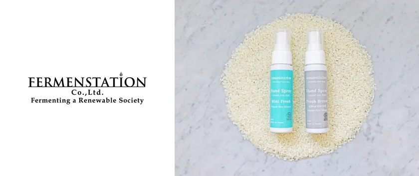 岩手県奥州市の休耕田を耕して育てた有機JASオーガニック米を、丁寧に発酵・蒸留して作るアルコール(エタノール)と、米もろみ粕などを用いたコスメと雑貨のブランド。生産者の顔のわかるトレーサブルな素材を使用し、天然成分100%へのこだわり、環境配慮のある容器の使用、つくる過程でごみを出さない取組みなど持続可能な社会づくりに貢献する商品です。2020年10月にリリースされた化粧品クオリティーのハンドスプレー(アルコール濃度70w/w%)(商品名:ファーメンステーションオーガニック認証ハンドスプレー)も販売します。