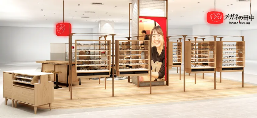 メガネの田中は創業100年以上の歴史があります。創業の地広島では、長く培われた確かな技術力でお客様から高く支持されています。コレットマーレ店では、普段お伝えする機会がない「メガネの田中が培ってきた100年」を表現したパネルディスプレイで、「メガネの田中とは」を伝えます。