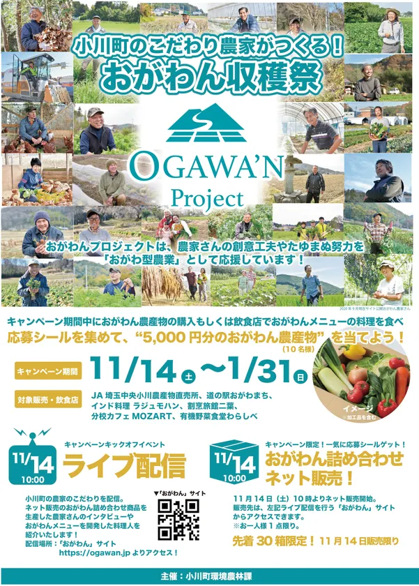 さらに「小川町のこだわり農家がつくる!“おがわん収穫祭”」のキャンペーン開始となる2020年11月14日(土)には、ネットでのライブ配信と、おがわん詰め合わせセットのネット販売を行います。おがわん詰め合わせセットは先着30箱限定で、販売価格は5,000円(税込・郵送費込)です。この機会に是非、おがわん農産物をお試しください。