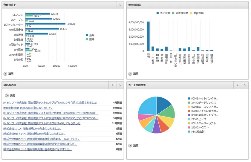 (1) 従来の簡易受注入力、在庫検索に加え、受注残、売上実績など販売管理システムの実績データをリアルタイムに確認できる機能を追加。Oracle Application Express(APEX)の分析機能を最大限に活用し、視覚的に集計・ソート・グラフ化等、強力なセルフサービス・レポート機能をブラウザー上で提供します。