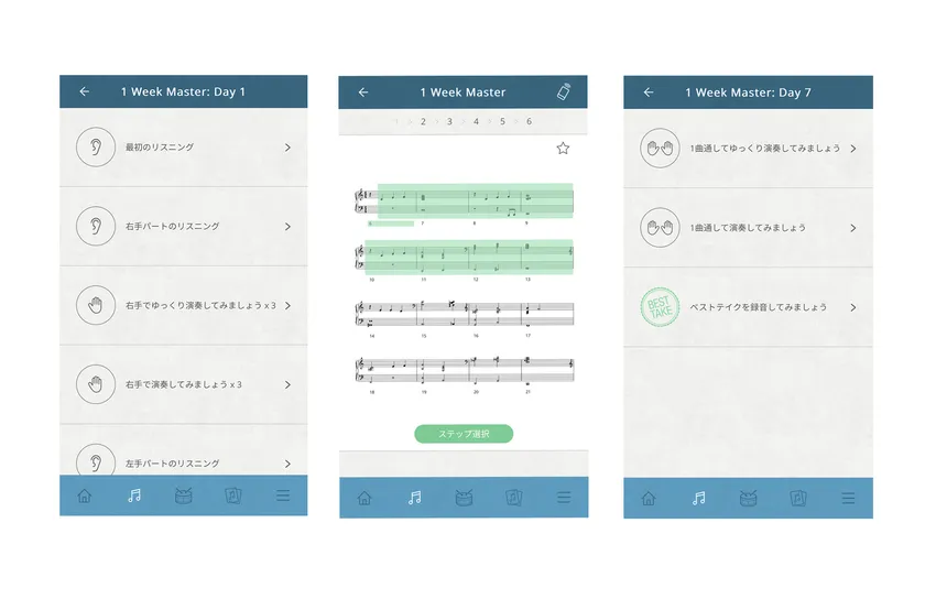 ピアノ生活を豊かにするアプリ「Piano Every Day」「1 Week Master」の画面