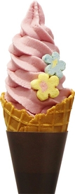 花菖蒲の季節だけの「花菖蒲ソフト」(税込500円)を販売しています。独特な酸味のあるジューシーな巨峰ソフトに可愛い花麩を添えました。