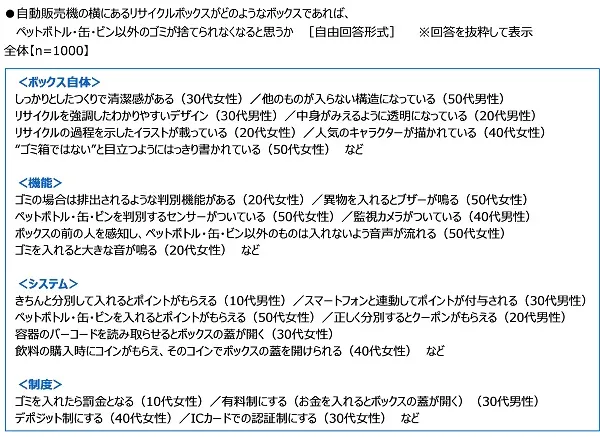 全回答者(1,000名)に、自動販売機の横にあるリサイクルボックスがどのようなボックスであれば、ペットボトル・缶・ビン以外のゴミが捨てられなくなると思うか聞いたところ、ボックス自体に関する内容として「他のものが入らない構造になっている」や「リサイクルを強調したわかりやすいデザイン」、「中身がみえるように透明になっている」といった回答が挙げられました。