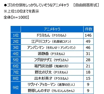 また、ゴミの分別をしっかりしていそうなアニメキャラを聞いたところ、「ドラえもん(ドラえもん)」(146件)がダントツ、2位「江戸川コナン(名探偵コナン)」(49件)、3位「アンパンマン(それいけ!アンパンマン)」(46件)、4位「源静香(ドラえもん)」(31件)、5位「フグ田サザエ(サザエさん)」(28件)となりました。