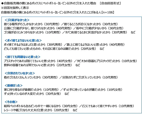 自動販売機の横にあるボックスにペットボトル・缶・ビン以外のゴミを入れたことがある人(106名)に、ゴミを入れた理由を聞いたところ、「捨てる場所がそこしかなかったから」や「ゴミ箱が近くにみつからなかったから」といったゴミ箱がなかったという回答、「ポイ捨てするよりはましだと思ったから」や「路上に捨てるよりはいいと思ったから」といったポイ捨てよりはいいと思ったという回答が多くみられました。