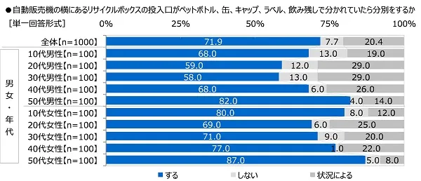 全回答者(1,000名)に、自動販売機の横にあるリサイクルボックスの投入口がペットボトル、缶、キャップ、ラベル、飲み残しで分かれていたら分別をするか聞いたところ、「する」は71.9%、「しない」は7.7%、「状況による」は20.4%となりました。大半の人は、投入口が分かれていれば適切に分別して入れると考えているようです。