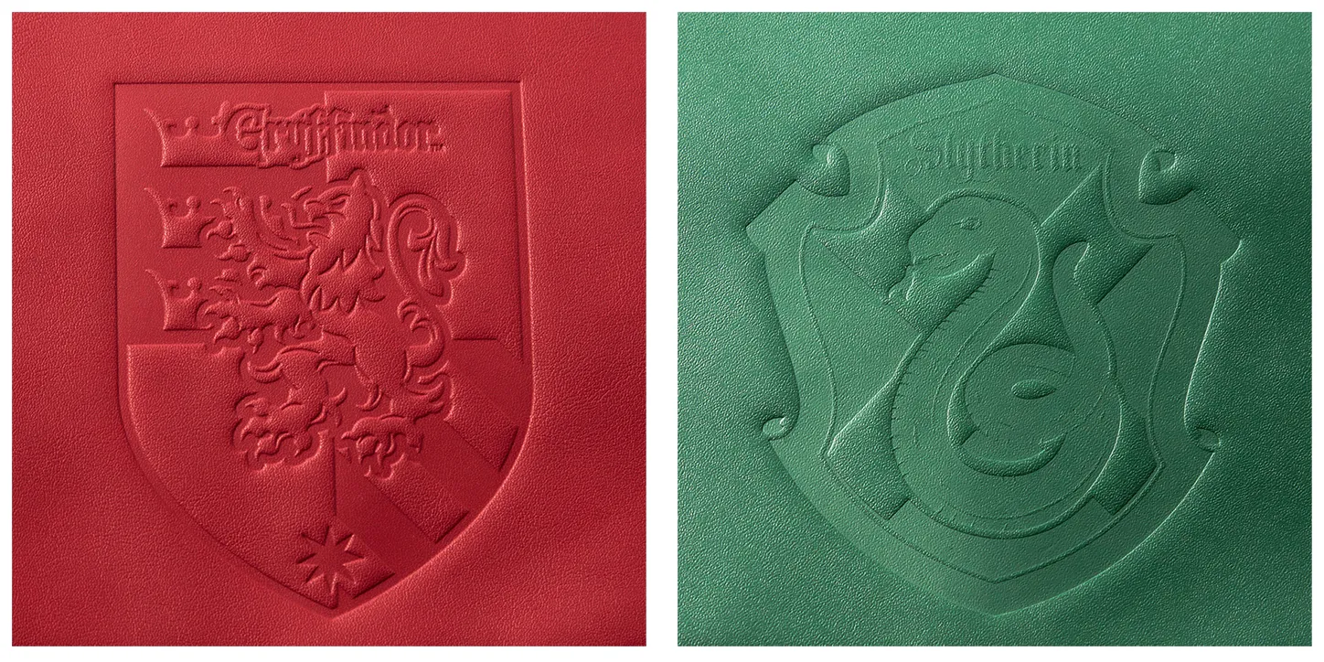 フラップ部分にグリフィンドール・スリザリンそれぞれの寮章を型押し