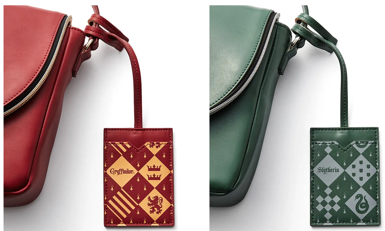 各寮のロゴやモチーフをプリントしたパスケースチャーム付かぶせフラップのファスナー引手もイメージカラーを使用