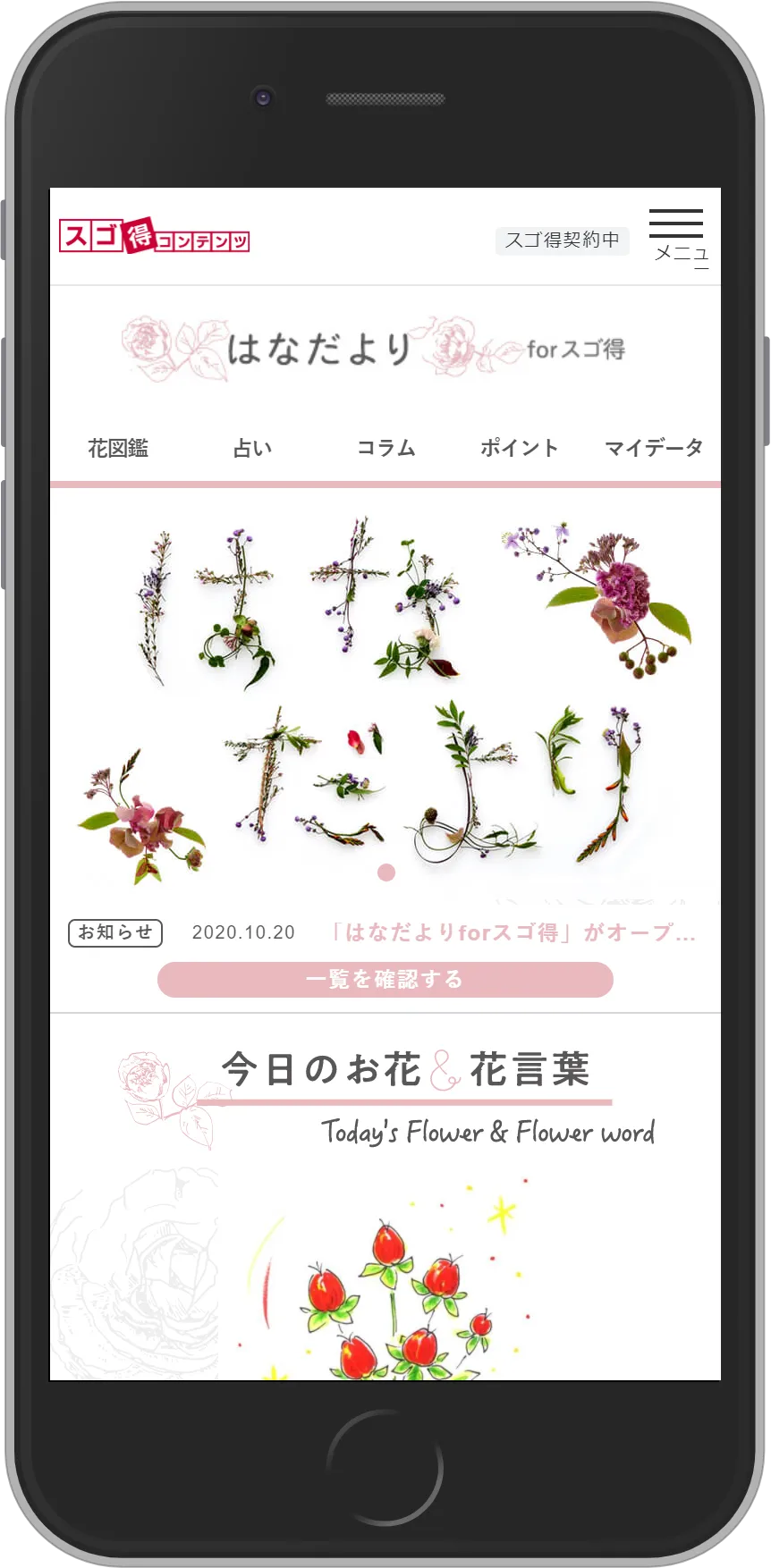 「はなだよりforスゴ得」では、「今日のお花(誕生花)」をチェック・検索できる「花図鑑」、その日の運勢と「今日のあなたにおススメのお花」がわかる「花占い」、自宅で気軽に花を楽しむためのHow toや季節に合わせた花の贈り方、楽しみ方を紹介する「コラム」、「スゴ得限定特典」、気に入った365日の花のイラストやコラムなどを登録、管理できる「マイデータ」の、大きく5つのコンテンツを搭載し、提供します。