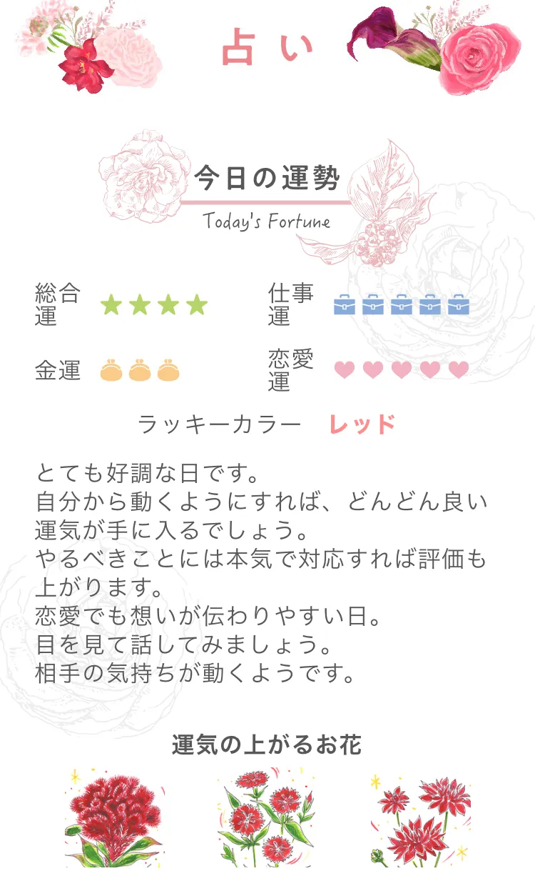 登録するニックネーム、性別、誕生月日、出生地などから「今日の運勢」(総合運/金運/仕事運/恋愛運)を占え、その結果から「今日のあなたのオススメの花」を閲覧できます。その他、占いたい相手の性別、誕生月日、出生地などを入力すると、相手との相性・運勢を占え、その結果から2人にオススメの花を閲覧できます。