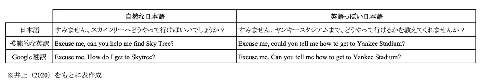 一方、日常的な対人コミュニケーションで、機械翻訳を使いこなすためには「英語っぽい日本語」、つまり翻訳を意識した、英語的な発想による日本語が必要ですが、「主語と動詞などの述部の関係が英語と日本語で大きく違うことがある、といった発想が身についていないと、『英語っぽい日本語』は書けない」と井上教授。例えば、話しことばをそのまま機械で翻訳すると、文法的な特徴を機械で正確に翻訳することがまだまだ難しく、不自然な英語になるといいます(井上, 2020)。