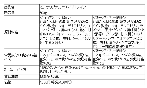 「RE オリジナルホエイプロテイン」は、長年のスポーツクラブ運営ノウハウによって蓄積した知見を活かした、当社ならではのサプリメントであり、トレーニングに励むお客様の栄養補給を考えた新商品です。