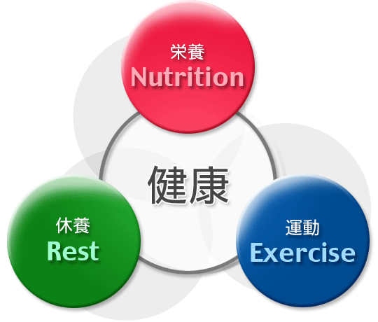 健康の維持・増進 に欠かせない要素は「運動」、「栄養 」、「休養」であり、この3つのバランスを保つことが重要となります。