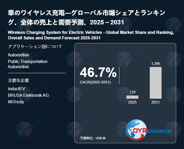 QYResearchが発表した新たな市場調査レポート「車のワイヤレス充電―グローバル市場シェアとランキング、全体の売上と需要予測、2026~2032」によると、世界の車のワイヤレス充電市場規模は2024年の約98百万米ドルから2025年の129百万米ドルへと順調に拡大すると見込まれ、予測期間中は年平均成長率(CAGR)46.7%で成長し、2031年には1286百万米ドルに達すると予測されている。