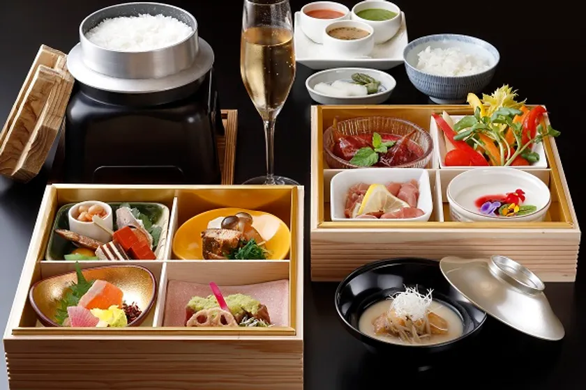器には、木製白木の二段重箱を使用。高級感を演出し、重箱を開けたときのワクワク感を引き立たせます。「日本料理 おおみ」でも好評の棚田米の釜炊きご飯は、一組ずつ丁寧に炊き上げ、旨みと風味を閉じ込めた状態でお部屋にお届けします。