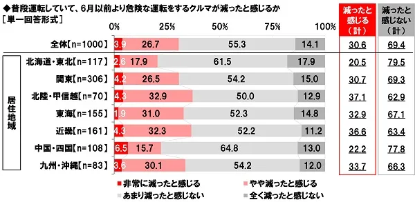 では、改正道路交通法や改正自動車運転処罰法の施行時期を境に、運転環境に変化があったと感じている人はどのくらいいるのでしょうか。