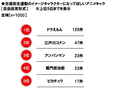 また、交通安全運動のイメージキャラクターになってほしいアニメキャラを聞いたところ、「ドラえもん」がダントツ、2位「江戸川コナン」、3位「アンパンマン」、4位「竈門炭治郎」、5位「ピカチュウ」となりました。