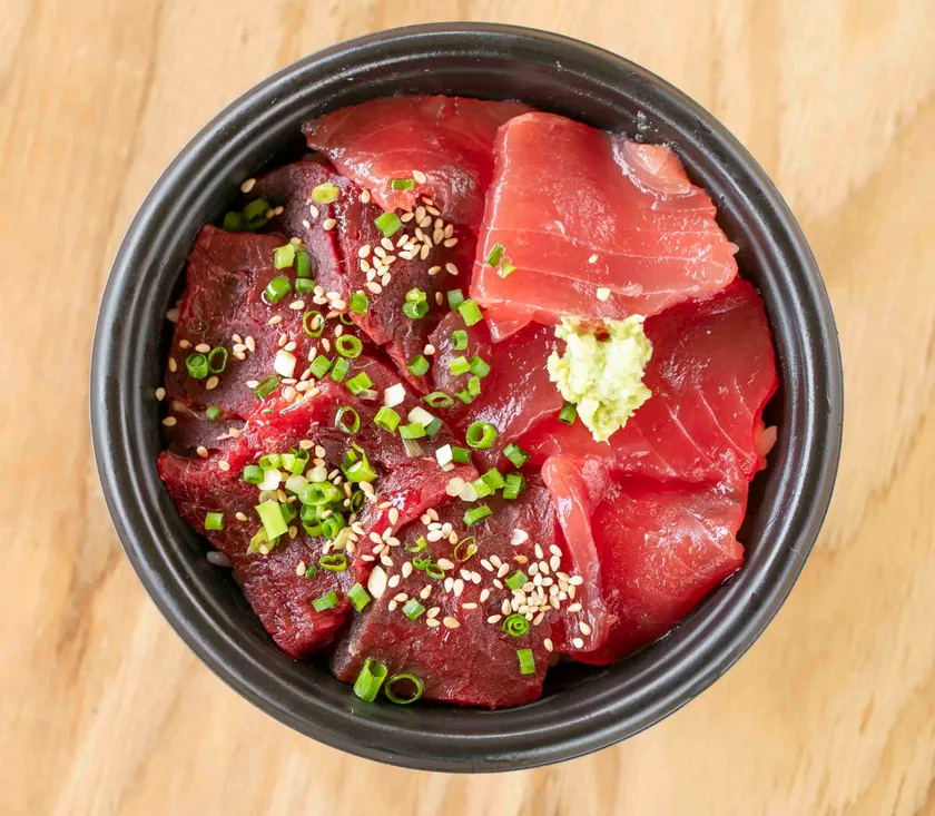 ねぎとろ、びんとろ、中とろの3つのトロが盛り込まれた、トロとろとろ丼。さらに赤身と漬けまぐろを盛り付けた、まぐろの豪華5種盛りです。いろいろなまぐろのお味をお楽しみいただけます。
