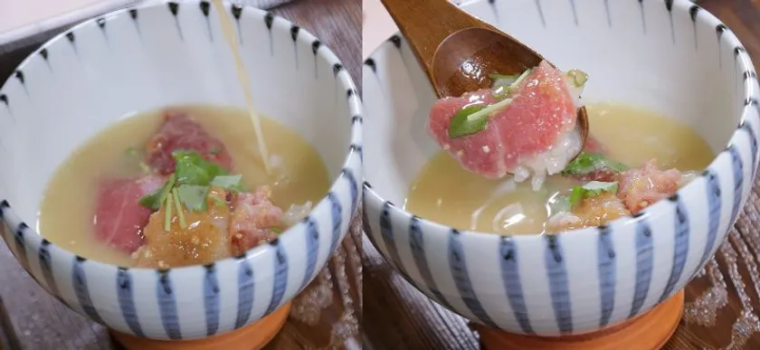 ご飯とお刺身を一口残し、海鮮丼と良く合うアツアツの濃厚魚介出汁をお好みの量かけて〆の出汁茶漬けとしてお召し上がりいただけます。出汁の濃厚な旨みと、熱が加わることでお刺身の食感にも変化が!一度食べたらハマる事間違いなしのおすすめの食べ方です。