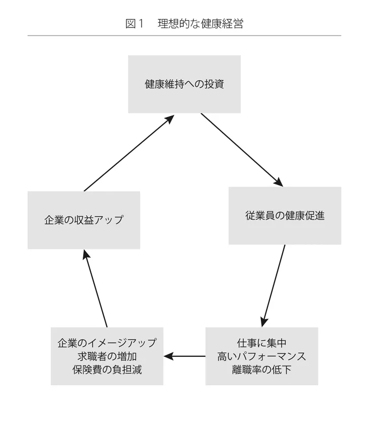 「健康維持への投資」→「従業員の健康促進」→「仕事に集中、高いパフォーマンス、離職率の低下」→「企業のイメージアップ、求職者の増加、保険費の負担減」→「企業の収益アップ」→(冒頭の)「健康維持への投資」(図1参照)