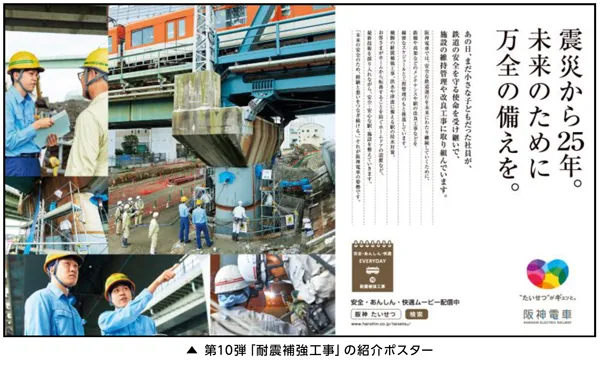 第10弾では、本線正蓮寺川橋梁耐震補強工事を紹介。当社は25年前に発生した阪神・淡路大震災で甚大な被害を受けましたが、グループ会社と団結し、沿線の皆さまからの励ましもあり早期に全線復旧を果たしました。当時、まだ幼かった者が、今では入社して震災時の体験談を上司や先輩から教わっています。若手社員が、鉄道の安全を守る使命と想いを受け継ぎ、施設の維持管理や改良工事に取り組む姿を発信します。