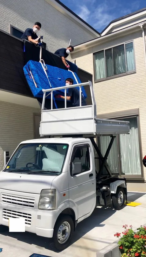 道路が狭い住宅街にある戸建ての2階に家具や大型家電を搬入するために、荷台のリフトアップが可能です。作業員が荷台に乗ったままリモコンでリフト操作も行うことができます。これにより、人員の削減ができコストカットはもちろん、家屋事故の防止にもつながっております。