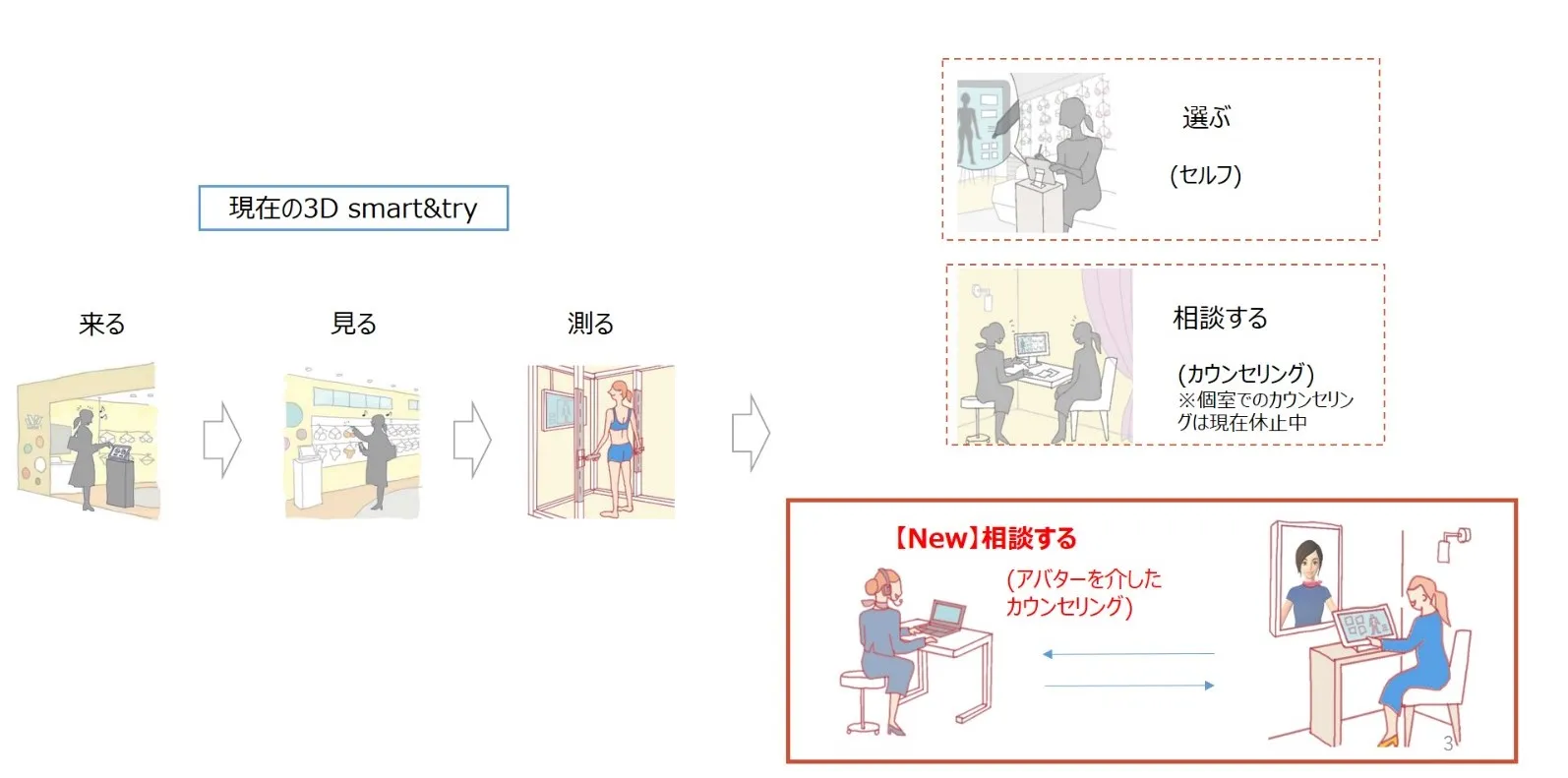 3D smart & try東急プラザ表参道原宿店では、「Ava.COUNSELINGパルレ」導入により、現在の3Dボディスキャナーによる計測後に、以下の3つの対応から、インナーウェア選びを行うことが可能になります。