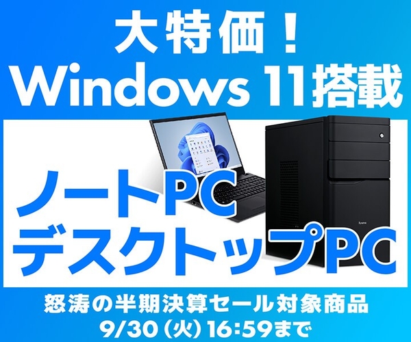 パソコン工房インターネット通販ではただいま『大特価 ! Windows 11搭載ノートPC・デスクトップPC』を9/30(火)16:59まで実施中!