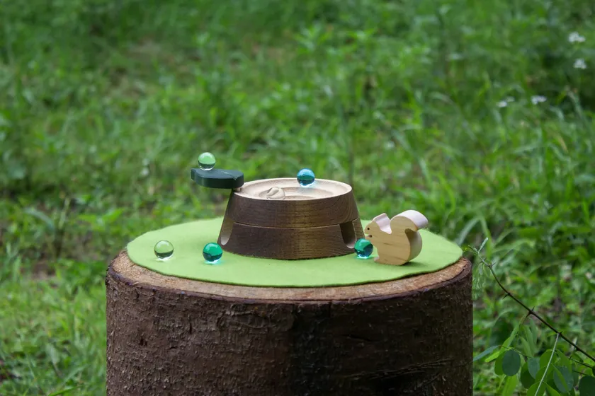 玩具の新作「しずくの森あそび」は、葉っぱから切り株に見立てた台の上を、“しずく”のビー玉がくるくると転がり、3つに開けた穴からランダムに転がり出ます。くるくる転がる“しずく”の動きを楽しみながら、どの穴から転がり出るか、1人あそびとしても対戦ゲームとしても遊べます。