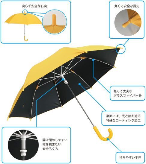 雨傘は雨を防ぐのみですが、晴雨兼用傘は傘生地の裏面に特殊なコーティング加工を施すことにより、雨・紫外線(UV)・可視光線(光)・赤外線(熱)を防ぎます。