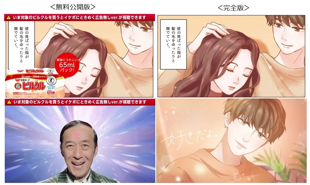 お買い上げいただいた「ピルクル」のパッケージにある二次元コードを読み取れば、“邪魔”な広告は一切出なくなり、“完全版”の胸キュンストーリーを心ゆくまでお楽しみいただけます。なお、お買い上げいただく商品によって、視聴できるストーリーはランダムとなります。