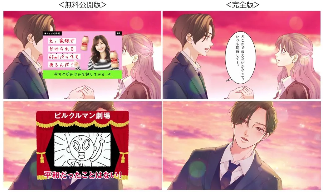 全4篇の「ロマンチック・ストーリー」には、特設サイトでどなたでもご覧いただける“無料公開版”と、「ピルクル」をお買い上げいただいた方だけが見ることのできる“完全版”の2種類があります。
