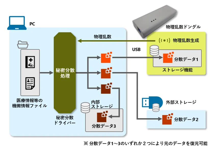 開発したストレージシステムのプロトタイプは、物理乱数ドングル、PC上で動作する秘密分散ドライバー、外部ストレージ(USBメモリ)で構成されます(図1)。物理乱数ドングルは携帯電話程度の大きさで可搬性に優れ、USB接続なのでPCへの脱着も容易です。秘密分散ドライバーは、当該物理乱数ドングルで生成した物理乱数を用いて、秘密分散技術によりデータを無意味化し、3つに分散されたデータ(分散データ)を作成します。将来、コンピュータ性能がいかに向上しようとも、量子コンピュータが実用化しようとも、一つの分散データから元の情報を復元することは理論的にできません。分散データを保存したハードディスクなどのメディアを分散管理すれば、紛失時や廃棄時などにおいて、情報漏えいが発生する危険性はなくなります。この特徴により超長期の情報保管を可能にし、人の寿命を100年としてもそれをゆうに超える世代間でのデータ保護を可能にしました。