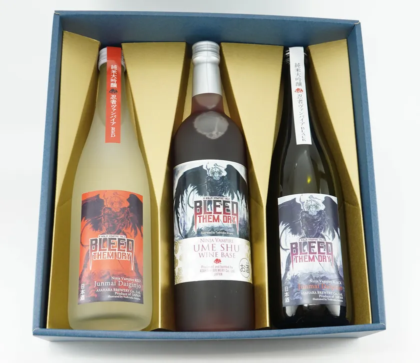 忍者ヴァンパイアのキービジュアルはファイナルファンタジーシリーズのキャラクターデザイナーとして世界的な人気を誇るアーティスト、天野喜孝氏が手掛けており、今回販売の特別酒はこのキービジュアルをベースにパッケージデザインがされています。