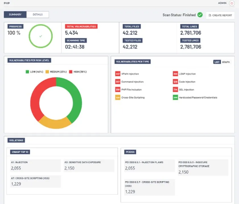 ・PCI DSS、NIST、OWASP Top 10、HITRUST、HIPAA、SANS/CWE Top 25等のセキュリティ基準に対するコンプライアンス違反状況のチェック、レポート作成が可能