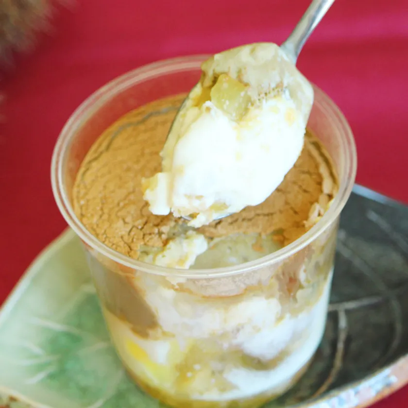 上段はほうじ茶クリーム、下段にはダイスカットしたアップルがたっぷりと混ぜ込まれたマスカルポーネクリームの層を楽しめます。後味にトップのシナモンがふわっと香る、味わい深いティラミスです。