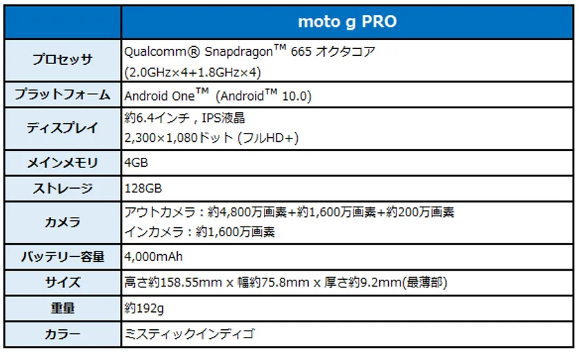「moto g PRO」は、BIGLOBEモバイル初のスタイラスペン(タッチペン)を搭載したモデルとなります。スタイラスペンを使うことで、ゲームアプリなどを利用する際にスライドやタッチ等の操作を正確に行うことが可能となります。また、設定をしておくとスタイラスペンを本体から引き抜くだけで専用のアプリが立ち上がり、気軽に手書きのメモを取ることができます。また、Android Oneプロジェクトにより最新のAndroid OSへのアップグレードが予定されており、Android 12まで最新のOS機能をお使いいただけます。2年間のメーカー保証付き(※通常は1年間)で、安心してご利用いただける機種となっています。カラーは、ミスティックインディゴの1色となります。