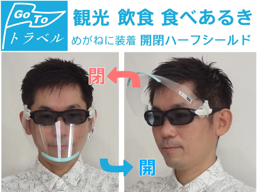 メガネに装着し、肌に全く接触しない、透明で非常に薄いプラスチックのハーフ・フェイスシールドです。ちょっと飲む、食べるときに、マスクなどのように「置く場所」が必要なく、口周りに触れるものもないため、衛生的です。