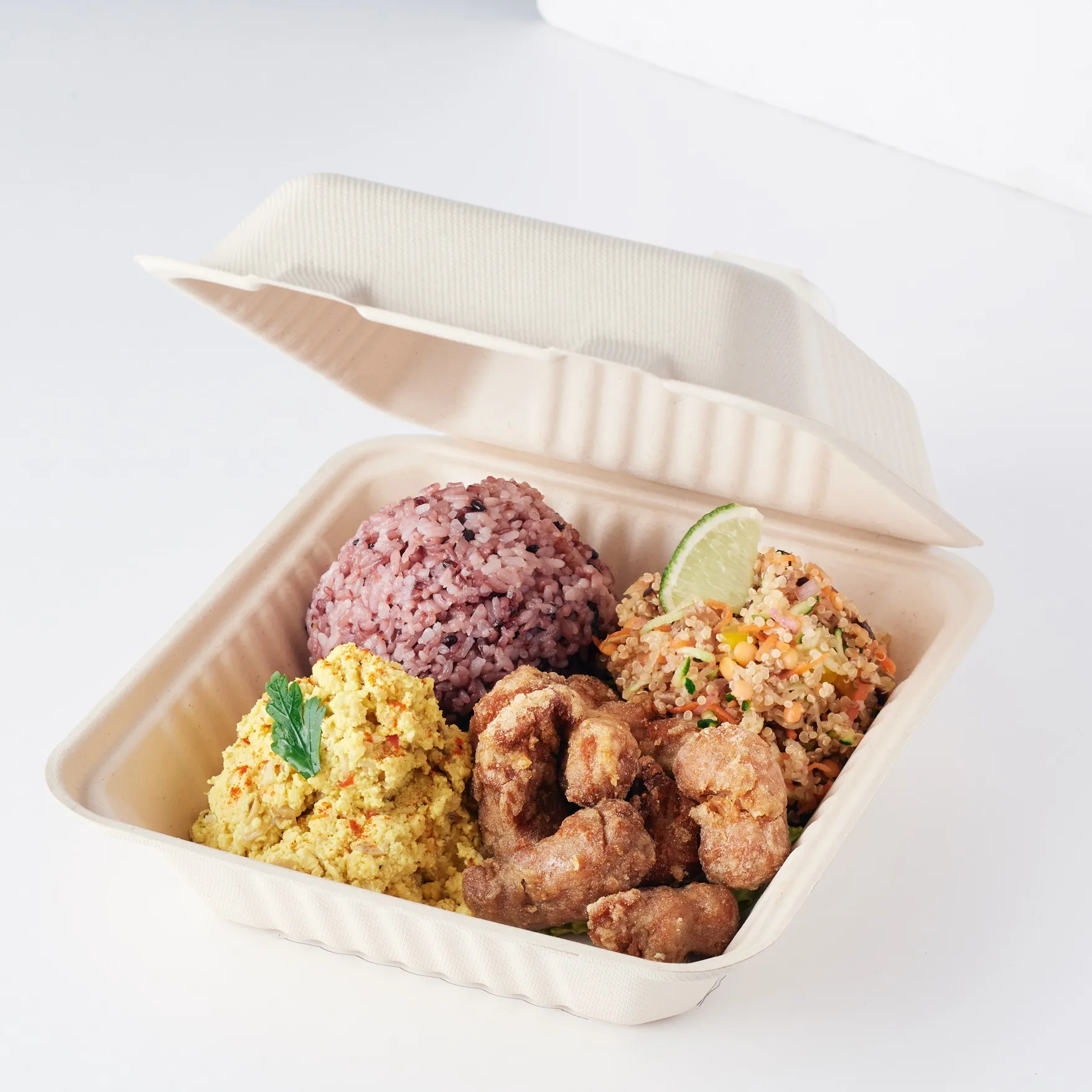 国産鶏にクミン・コリアンダー・山椒など数種類のスパイスをまぶし、スチームオーブンでじっくり焼いたスパイスチキン。鶏もも肉の下味には糀と玄米甘酒を使用しているので柔らかく焼き上がり、お肉の旨味も存分に味わえるお弁当です。