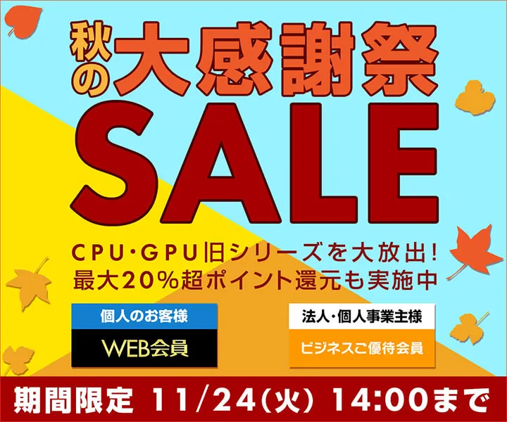 パソコン工房 Webサイトにて、『秋の大感謝祭セール』を開催! CPU・GPU旧シリーズを大放出!最大20%超ポイント還元も実施中