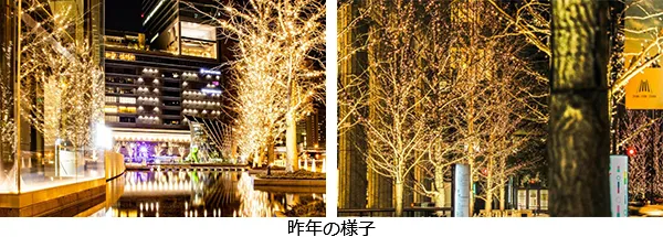 JR大阪駅前に広がる約1haに及ぶ「うめきた広場」の周辺や、けやき並木、北館西側歩道の樹木126本にシャンパンゴールド色のLED約40万球が上品に光り輝きます。