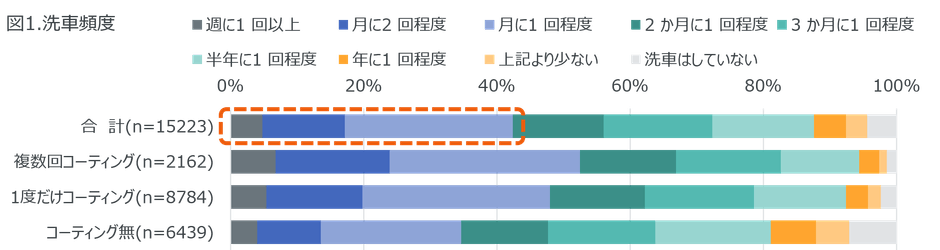 自動車保有者15,223人に対し洗車の頻度について調査したところ「月に1回程度」のペースで洗車をする人が最も多く25%を占め、月に1回以上洗車をする人は42%に上った(図1.オレンジ枠)。「3か月に1回程度」が16%、「半年に1回程度」が15%であった。車にコーティングをしている人は月に1回以上洗車をする割合が高く、購入時などに1度コーティングをした人では48%、複数回コーティングをした人では53%と愛車を綺麗に保ちたいという意識がうかがえる。洗車のきっかけでは「ボディの汚れが目立った」という回答が79%と圧倒的に多く、2番目の「前回から一定期間が経過」は19%、3番目の「フロントガラスの汚れが目立った」は16%に留まった。月に2回以上洗車をする人は「フロントガラスの汚れが目立った」が26%、「雨が降った後」が22%と車の汚れに対して敏感な様子が見られた。主な洗車手段については、自分で手洗いする人が49%、洗車機を利用する人が41%で両者を合わせて9割に至った。また、お店の手洗い洗車(有償)を利用する人は7%であった。