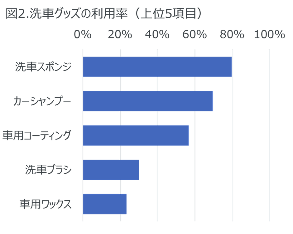 自分で手洗い洗車をする人の多くは自宅の駐車場や庭(86%)で行っており、洗車場を利用する人は9%であった。洗車時に使用する用品では洗車スポンジが80%、カーシャンプーが70%、車用コーティングが57%であった(図2)。カーシャンプーなどの用品を購入する際に参考にしている情報源は「インターネット上のレビューなど」が12%、「商品パッケージ」や「店頭の販促物」が10%、「YouTube動画」が8%であった。洗車頻度が多い人ほどインターネットのレビュー、YouTube動画を見る割合が高い傾向が見られ、よく使うアイテムだからこそ使用感を確認したいものと思われる。