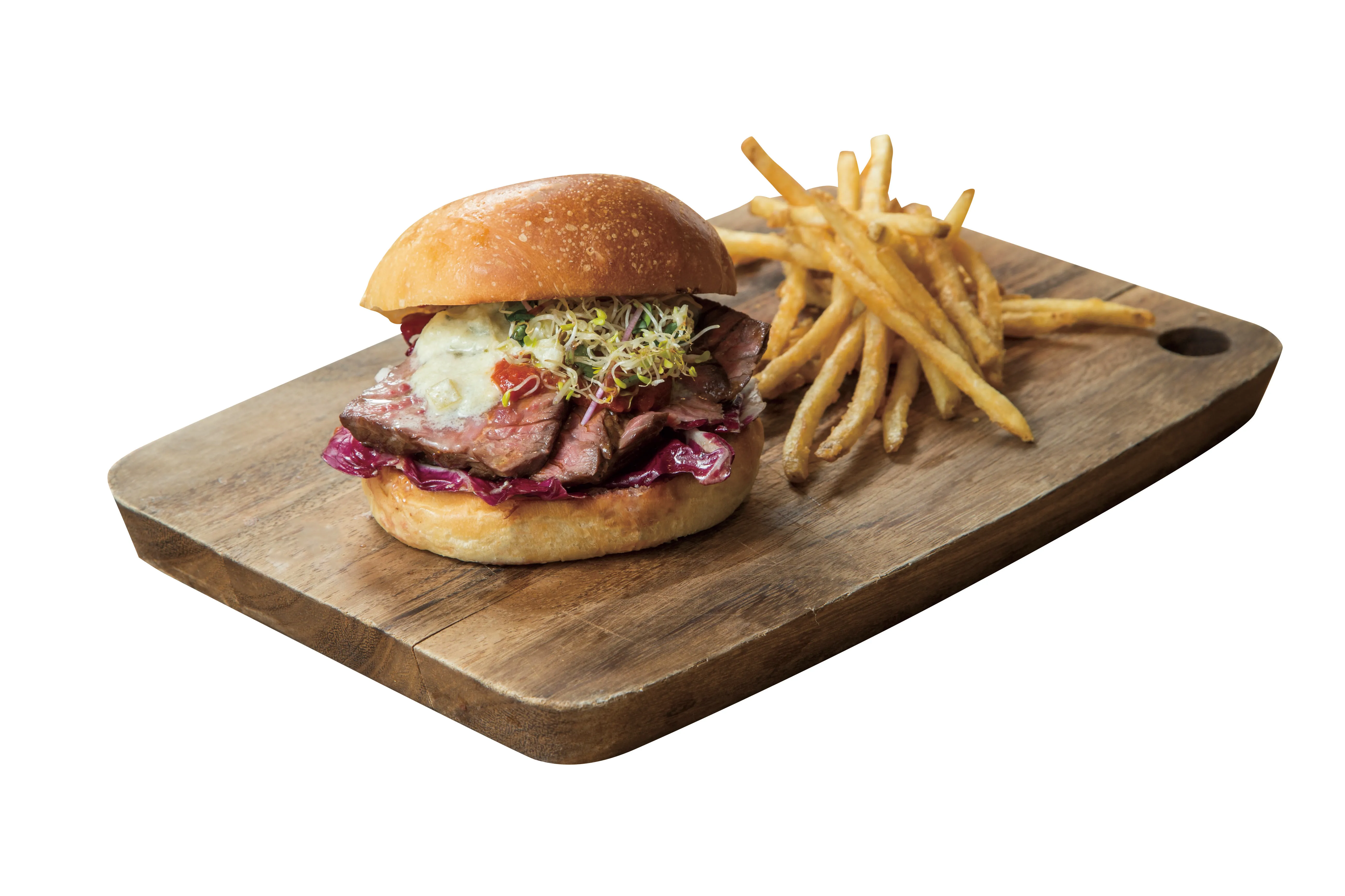 旨味あるステーキとゴルゴンゾーラの特製ソースを合わせたボリュームたっぷりの新作バーガー。