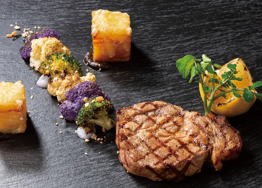 上質な脂とさっぱりとした旨味が人気の国産牛赤身肉を、ハーブガーリックオイルを塗り重ねながら串焼きにしました。すべてのグリル料理は、世界から厳選した計10種の塩・胡椒と計4種の自家製ソースからお好みの味でお楽しみにいただけます。カフェ・ド・パリ・バターの和風版「Cafe de Tokyo(カフェ・ド・トウキョウ)」は、生のり、ゆず胡椒、すだちが入った、魚のグリルにもぴったりなオリジナルソース。